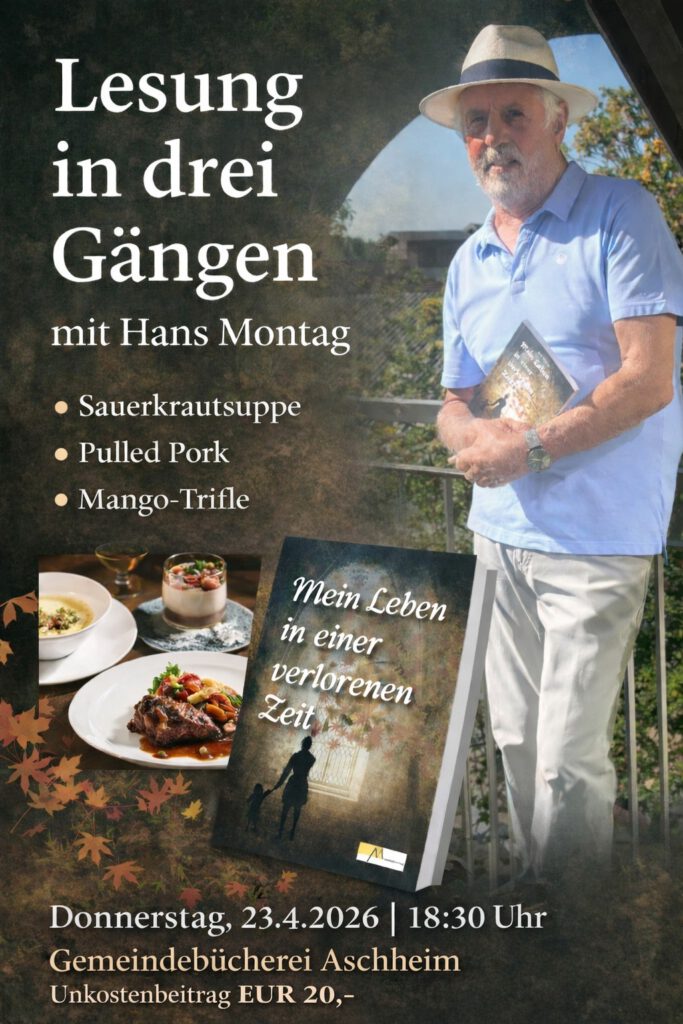 Die Gemeindebücherei Aschheim lädt Sie am Donnerstag, den 23.04.2026 um 18:30 Uhr, zu einem außergewöhnlichen Genuss ein: Der Autor und ambitionierte Koch Hans Montag liest aus seinem Roman: Mein Leben in einer verlorenen Zeit. Erzählt wird die Geschichte einer Frau aus München-Giesing zwischen 1924 und 1947. Franziska Bichler berichtet in Ichform von ihrer ärmlichen Kindheit, den Grausamkeiten der NS-Zeit und den Schrecken des Krieges.